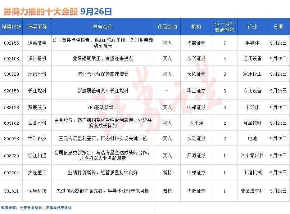 据证券之星数据库不完全统计,9月26日券商共给予近20家A股上市公司“买入”评级。从行业分布看,券商9月26日关注的个股聚焦于半导体、通用设备、家用轻工、专用设备、食品饮料、电池、汽车零部件等行业。